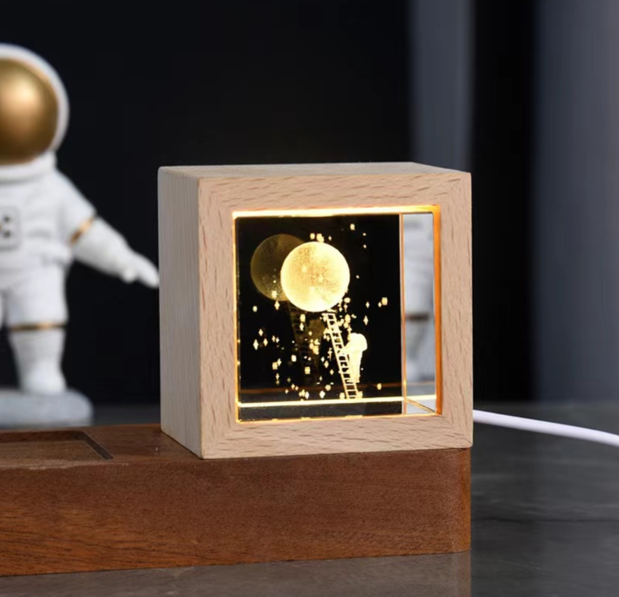 خرید و قیمت چراغ خواب مکعب کریستال با فرم چوبی طرح ماهدخت (ماه و دختر)/ سایز6.5*6.5