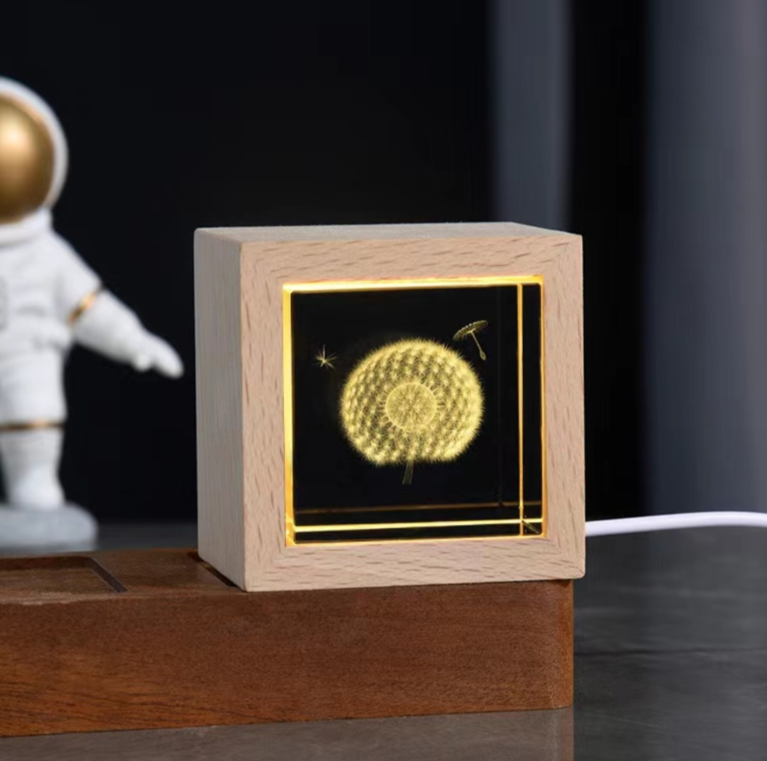 خرید و قیمت چراغ خواب مکعب کریستال با فرم چوبی طرح قاصدک سه بعدی/ سایز6.5*6.5