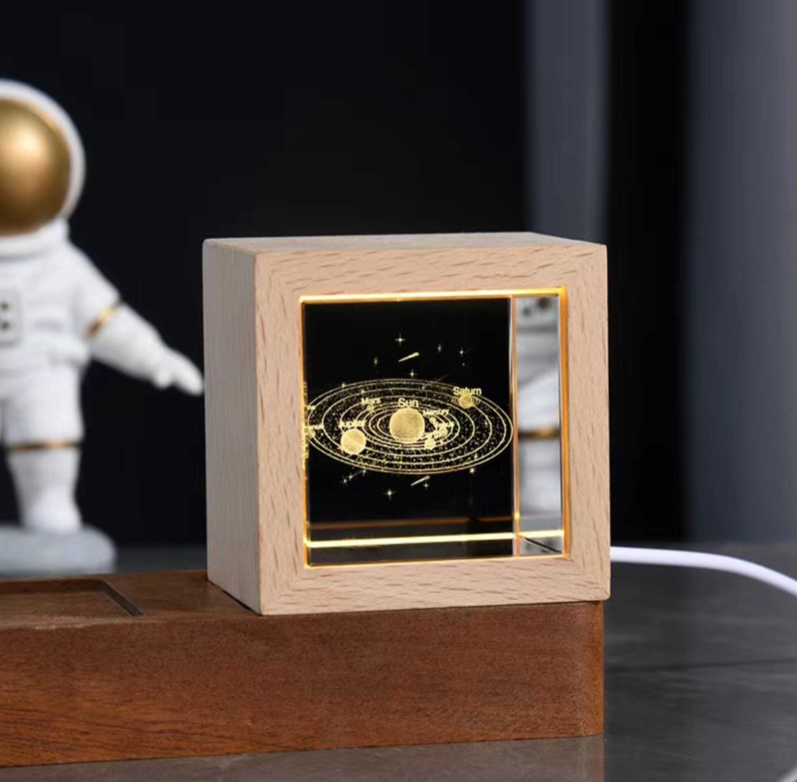 خرید و قیمت چراغ خواب مکعب کریستال با فرم چوبی طرح منظومه شمسی سه بعدی/ سایز6.5*6.5