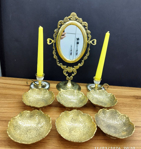 ست هفت سین برنجی همراه با آینه و شمعدان صدف کوبی شده برنجی هندی