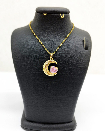 قیمت وخرید گردنبند ماه نگین قلبی صورتی/ نگین سوارسکی/ زنجیر ماری نازک استیل رنگ ثابت سیلور