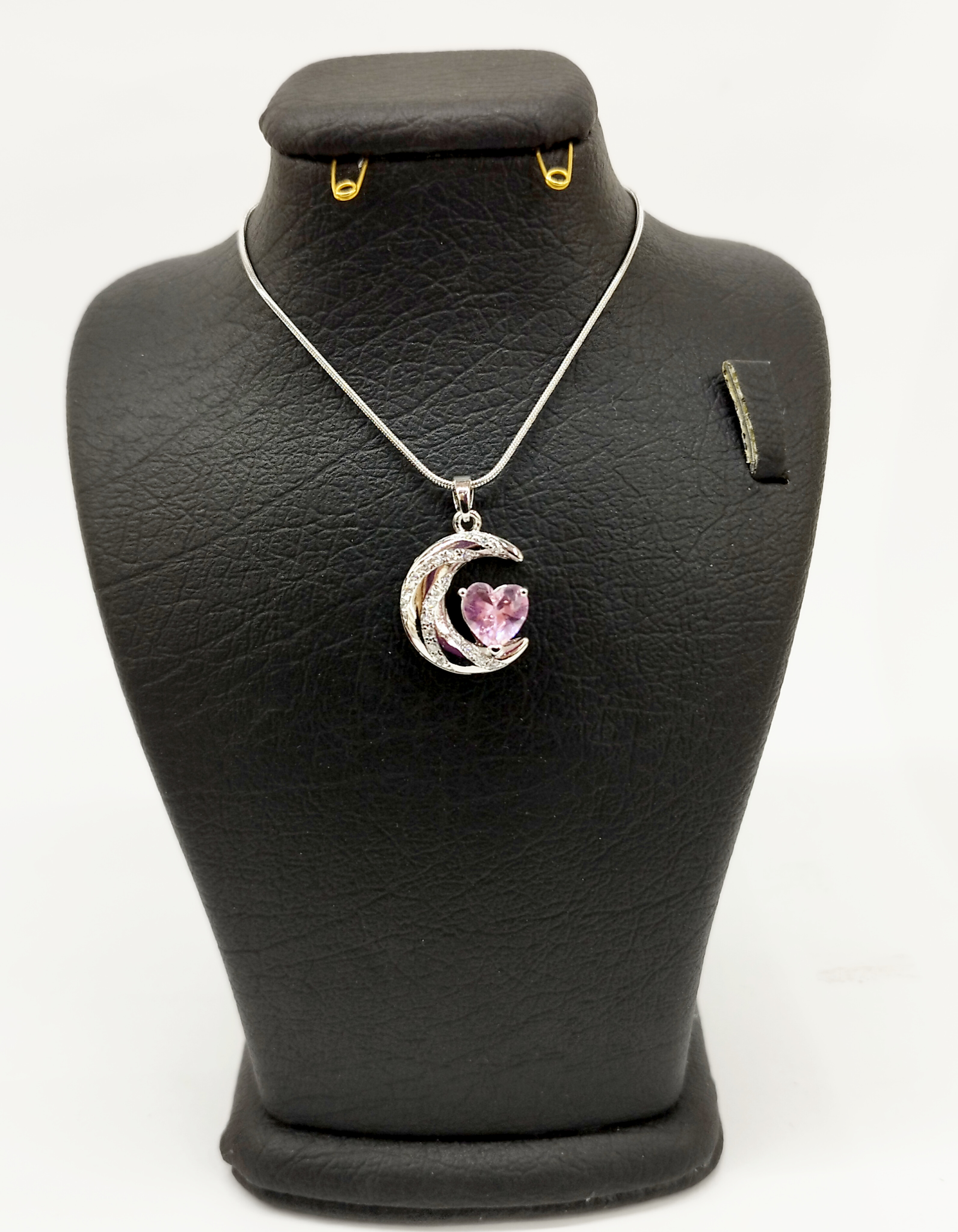 قیمت وخرید گردنبند ماه نگین قلبی صورتی/ نگین سوارسکی/ زنجیر ماری نازک استیل رنگ ثابت سیلور