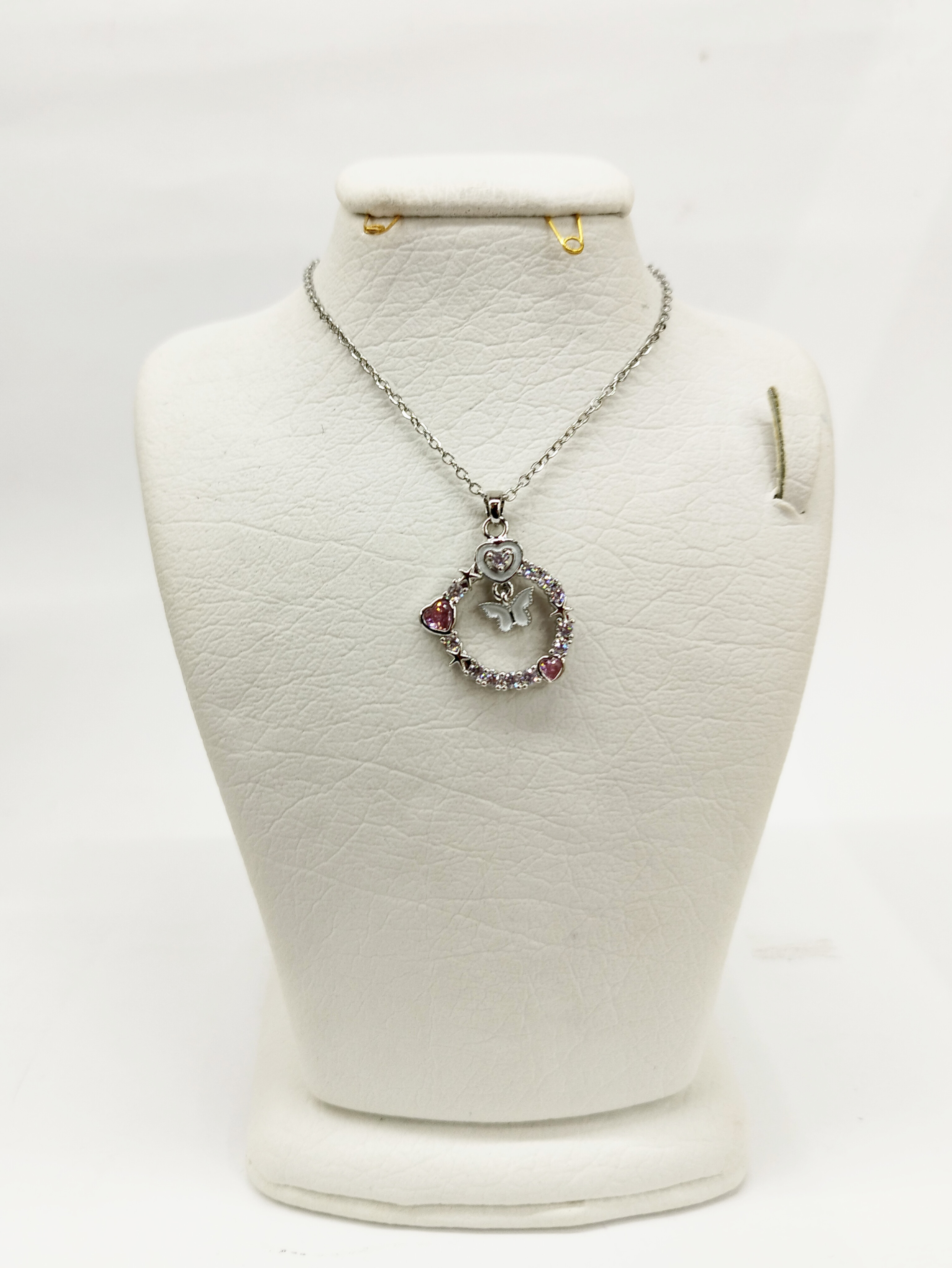 قیمت وخرید گردنبند پاپیون نگین صورتی/ نگین سوارسکی/ زنجیر دیپلمات استیل رنگ ثابت سیلور