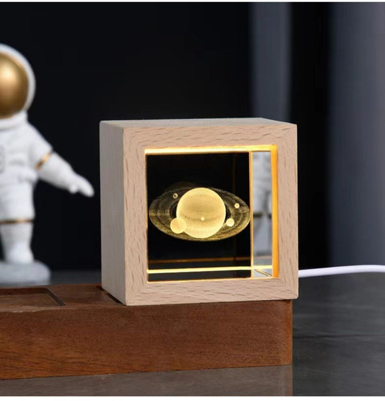 شب خواب کریستالی لیزری سه بعدی چراغ دار مکعب فریم چوبی 6/5×6/5 سانتیمتر زحل