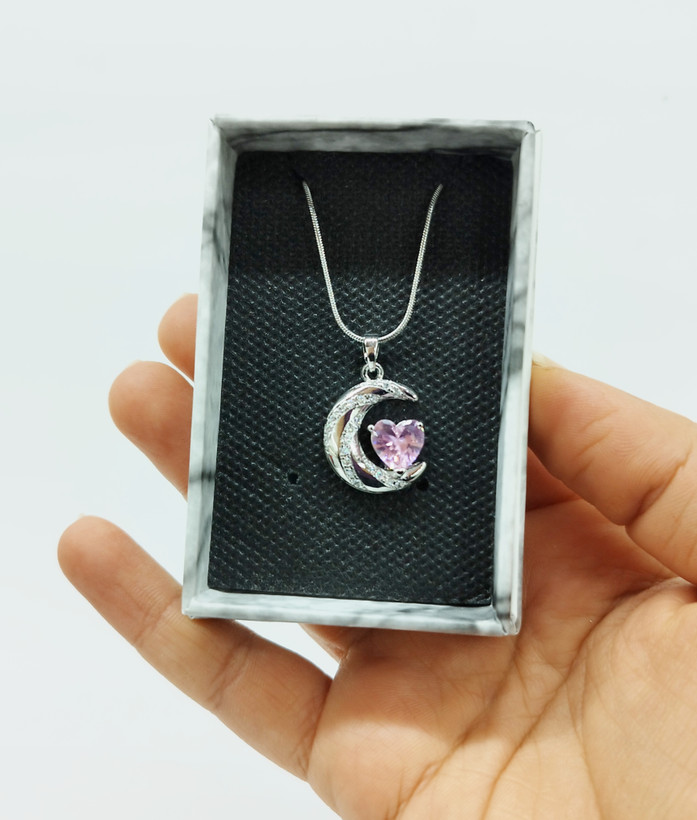 قیمت وخرید گردنبند ماه نگین قلبی صورتی/ نگین سوارسکی/ زنجیر ماری نازک استیل رنگ ثابت سیلور