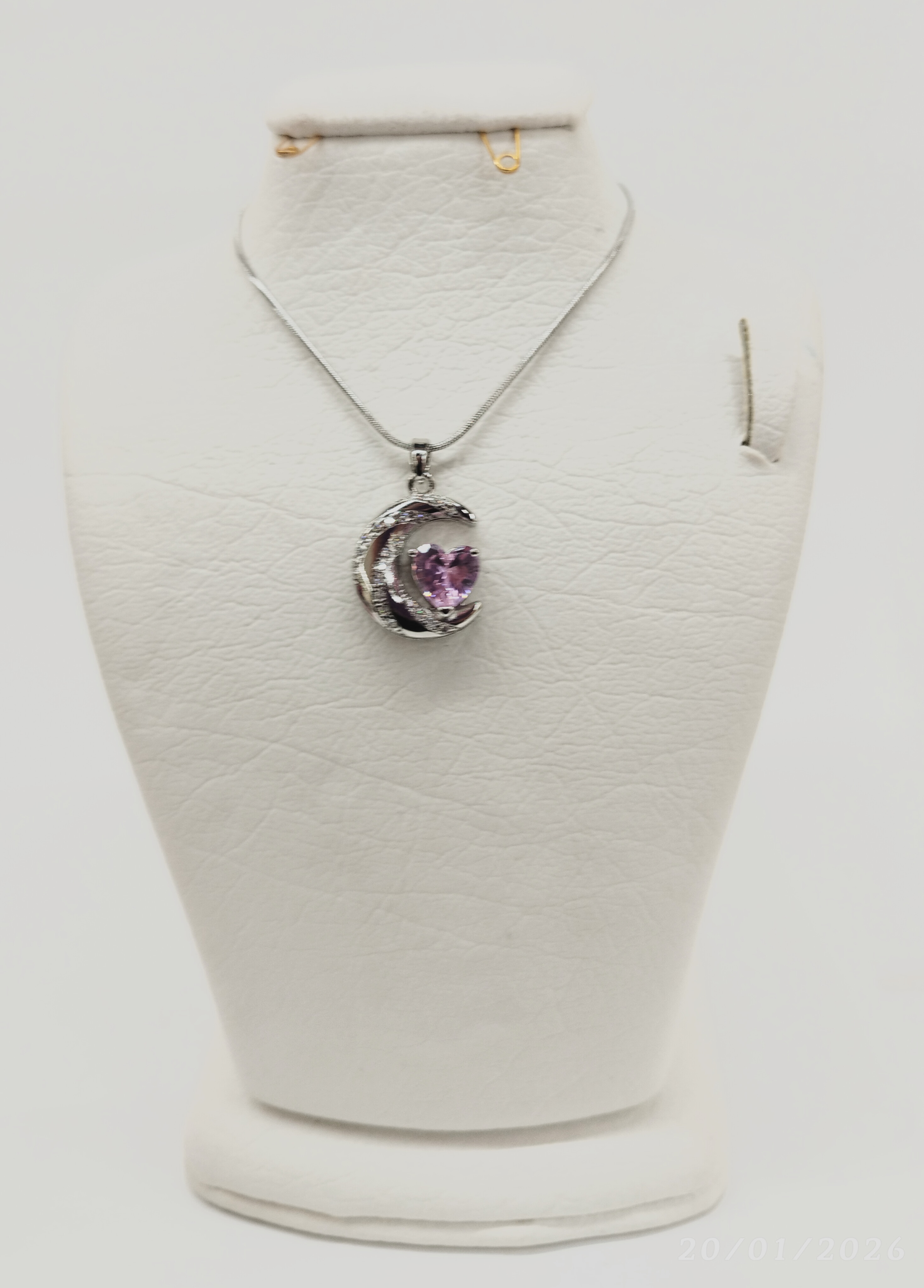 قیمت وخرید گردنبند ماه نگین قلبی صورتی/ نگین سوارسکی/ زنجیر ماری نازک استیل رنگ ثابت سیلور