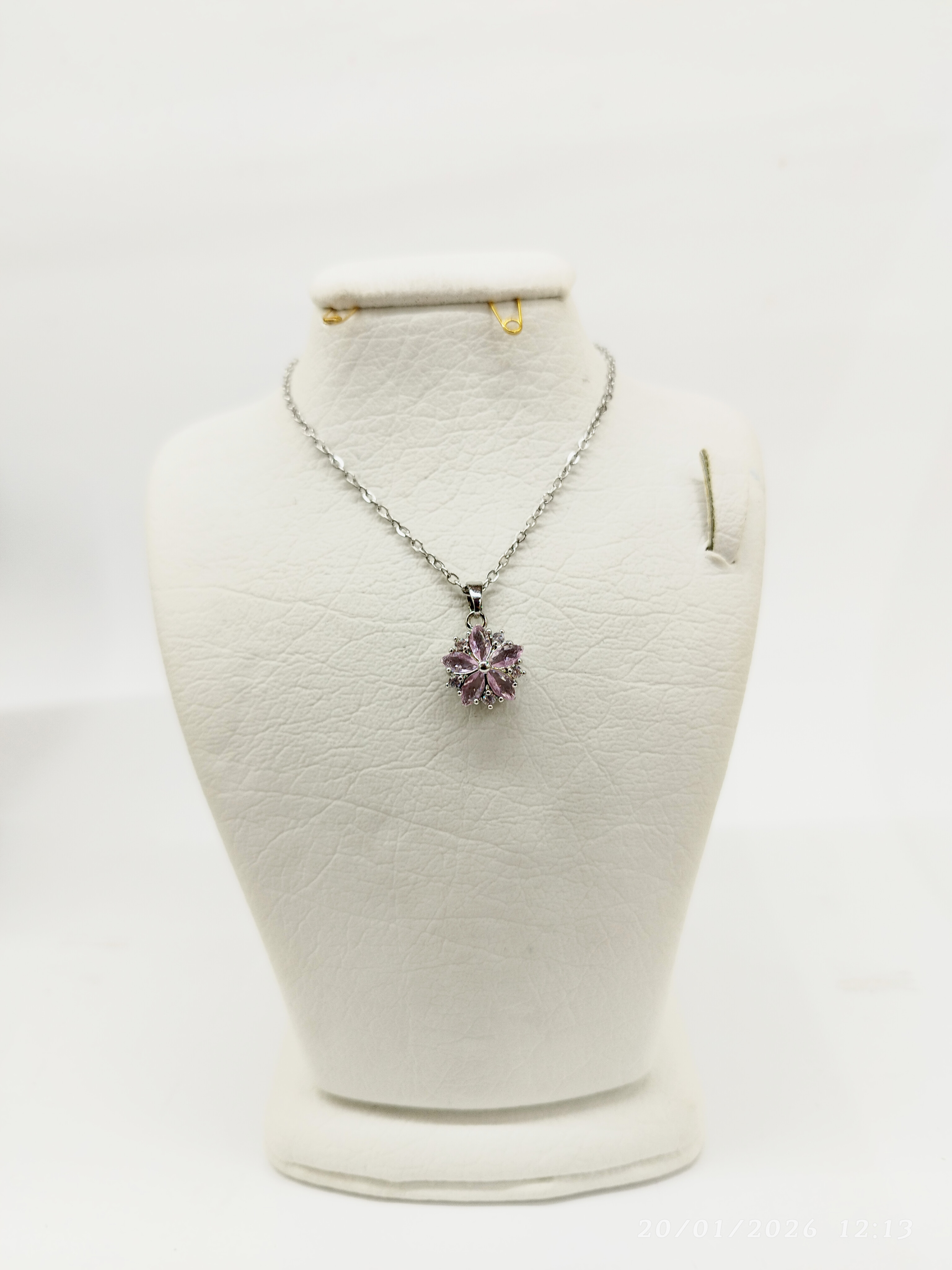قیمت وخرید گردنبند برفی نگین صورتی / نگین سوارسکی/ زنجیر دیپلمات استیل رنگ ثابت سیلور