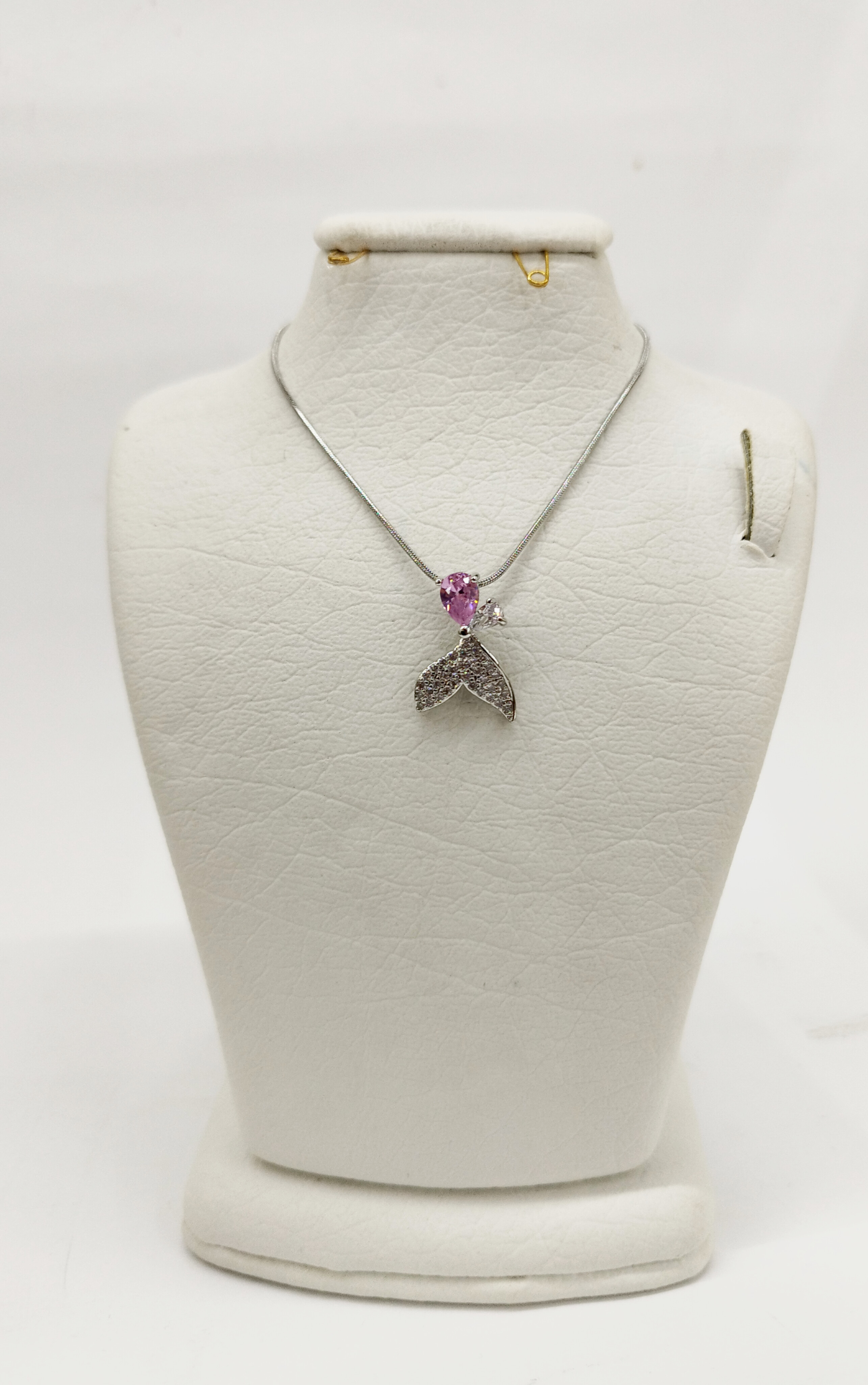 قیمت وخرید گردنبند دم وال تک نگین صورتی/ نگین سوارسکی/ زنجیر ماری نازک استیل رنگ ثابت سیلور