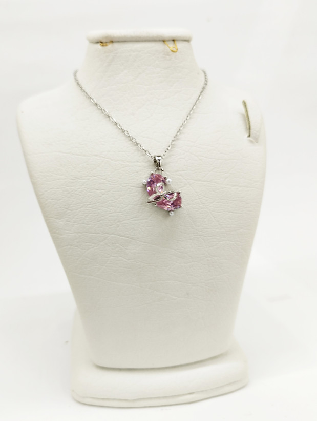 قیمت وخرید گردنبند پاپیون نگین صورتی/ نگین سوارسکی/ زنجیر دیپلمات استیل رنگ ثابت سیلور
