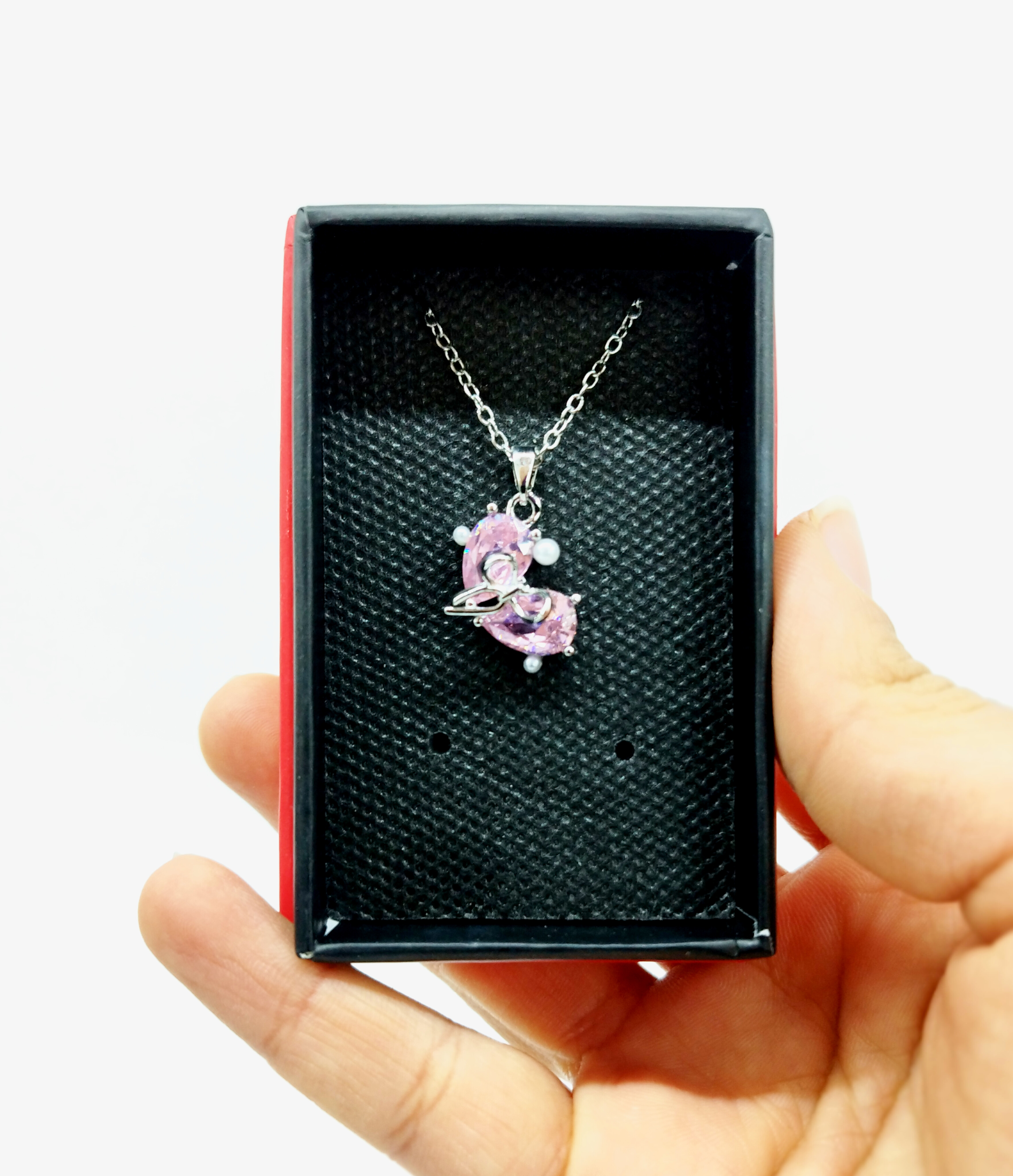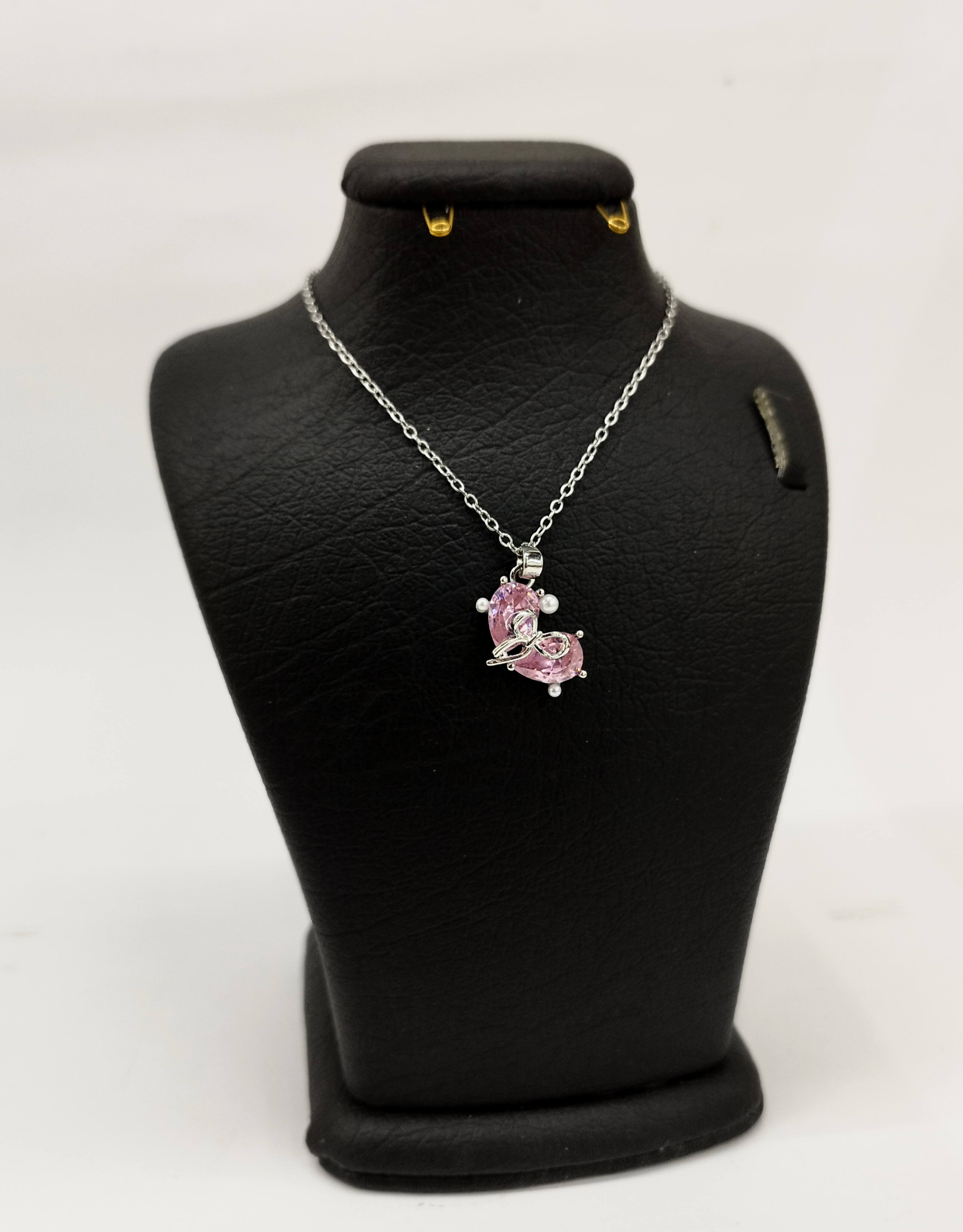 قیمت وخرید گردنبند پاپیون نگین صورتی/ نگین سوارسکی/ زنجیر دیپلمات استیل رنگ ثابت سیلور