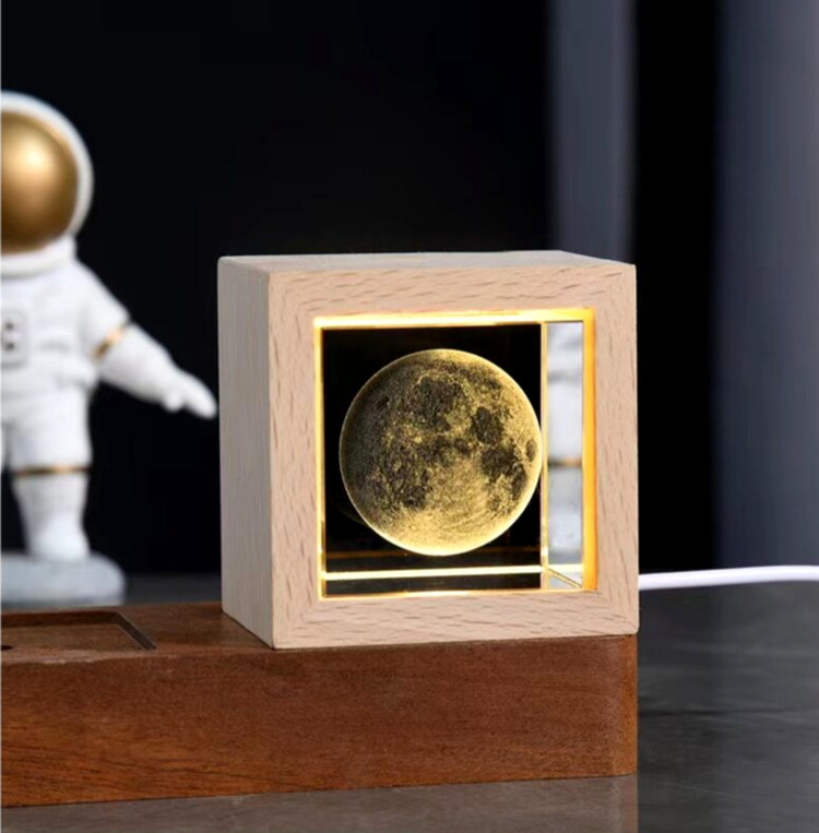 خرید و قیمت چراغ خواب مکعب کریستال با فرم چوبی طرح ماه سه بعدی/6.5 * 6.5 س